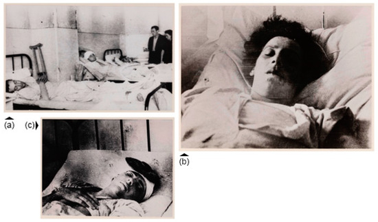 Among the photographs in the archives of the Jewish Historical Institute are those taken in the hospital depicting wounded survivors suffering from various kinds of injuries, and photographed from the perspective of a visitor standing by their bedside (Figure 4, Figure 5 and Figure 6). There are several differently cropped images deposited in the archive. There also exist photographs of corpses on the hospital floor; one of a woman and a baby, and three men partially covered with white sheets on the floor tiles, images of bodies piled up in the morgue, mutilated corpses photographed in close-up in their coffins, scenes from the funeral (groups of people marching, standing, and talking), and more images of coffins and of people mourning.