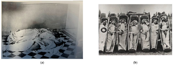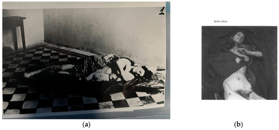 There also exists an image of three male victims lying on the same hospital floor (possibly shot at the same moment in the same room—(Figure 6a) recalling another historically charged image, this time of Paris communards, naked in their coffins (Figure 6b). One could surmise Pirotte had this image in her visual memory while pointing her camera at the dead Jews in Kielce. Why such an association—for some, possibly outrageous? The female traumatic gaze, which is argued for in this essay, is very much about making connections and overcoming well-established routes of historical thinking and feeling.