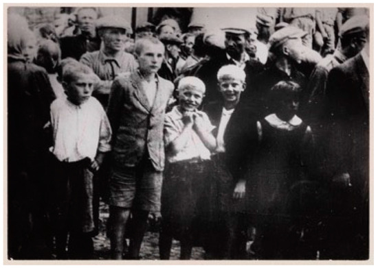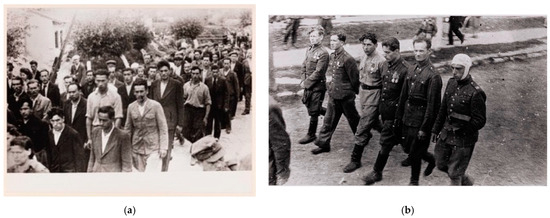 Last, but not least, Pirotte most probably photographed survivors of the pogrom, standing in groups, exchanging looks, talking, and gesturing to one another (Figure 10a,b).