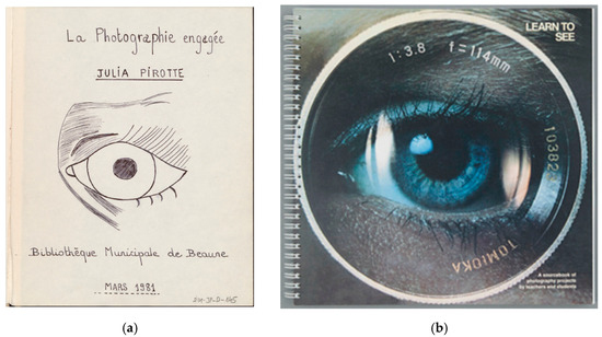 In the archive of the Jewish Historical Institute, I came across a hand-drawn cover of La Photographie engagé (engaged photography) by Julia Pirotte, for an exhibition at Bibliothèque Municipale de Beaune (1981). It illustrates the photographer’s engagement by means of a wide-open eye (Figure 11a). The eye that takes in what it views without blinking, the eye that sees too much but does not wish to miss anything, the eye that stays alert. Another female eye, this one photographed, can be found on the cover of a 1974 book by Susan Meiselas entitled Learn to See. A Sourcebook of Photography Projects by Students and Teacher (Figure 11b). In this book, she provides visual lessons in the photographic language, including the issues raised in the representations of the underprivileged or marginalized, or those excluded from the visual field.