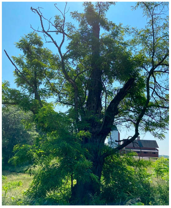 While walking the perimeter of the Oak Spring Garden Foundation property in Upperville, Virginia—a 700-acre estate and biocultural farm once owned by Paul Mellon and Rachel Lambert Mellon in the eastern Piedmont region of the Appalachian Mountain Range—the Foundation’s ecologist paused in front of a spindly black locust tree (Robinia pseudoacacia L.) [Figure 1].1 She explained to us—a cohort of artists, scholars, and creative writers in residence—that while the species is favored by humans for its easy propagation, the hardness of its wood, and the beauty and fragrant smell of its flowers, it is something of a global menace. The black locust is endemic to Appalachia, the very spot on which we stood and where its ubiquitous presence can be seen along the roadsides and open woods of northern Virginia, but the tree is considered invasive in almost all parts of the world where it has been introduced (Bouteiller et al. 2019, p. 2399). The ecologist then asked if anyone knew the site of the oldest known black locust. “Paris, France!”, she exclaimed as we moved on to marvel at an objectively more impressive 250-year-old white oak (Quercus alba L.).