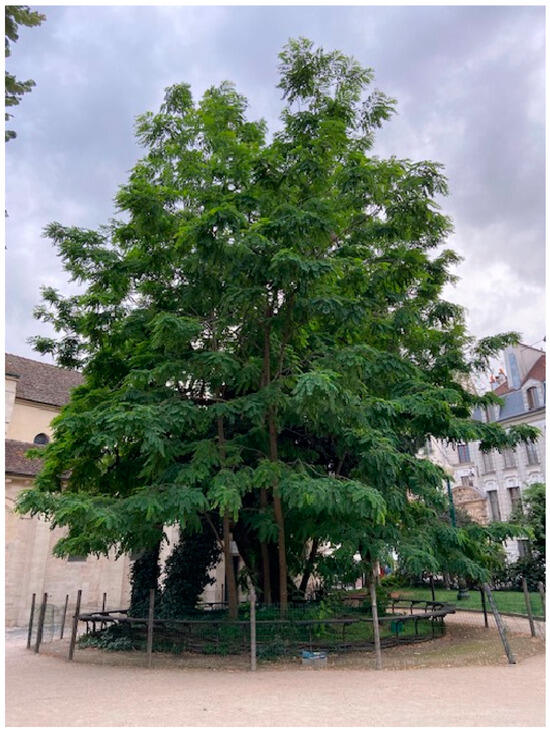 The oldest known and recorded black locust grows on a site a few meters from the River Seine in central Paris [Figure 2]. It was planted between 1620 and 1622 by the gardener, herbalist, and arborist Jean Robin, after whom the genus was named. The species was given its current scientific name—Robinia pseudoacacia—by the Swedish botanist Carl Linnaeus in his Species plantarum of 1753 (Linnaeus 1753, vol. II, p. 722). Though propped up by concrete supports, the 400-year-old Virginia tree is considered the oldest tree of any kind in Paris. It stands in what today might paradoxically be characterized as a quiet corner of the city center, in the shadow of Saint-Julien-le-Pauvre, a modest thirteenth-century parish church, and mere steps away from the medieval Cathédrale Notre-Dame de Paris, among the most prominent of Western European landmarks, the decidedly more modern Shakespeare and Company bookstore, and the many shawarma shops catering to students and tourists in the Latin Quarter. Though the tree has been eclipsed by its more prominent neighbors, this singular material being has retained its status as an American curiosity in Europe and, as indicated by the protective railing surrounding it, a perpetual site of interest. Indeed, the status of the tree as among the earliest “New World” introductions to France is what has safeguarded the living organism through wars, regime changes, industrialization, natural and human-caused environmental disasters, and the accelerated urbanization of central Paris since the seventeenth century. The survival of the tree is due, in part, to the longstanding human fascination with and veneration of what environmental historian Jared Farmer has termed elderflora, very old plants whose lifespans far exceed that of a human being (Farmer 2022).
