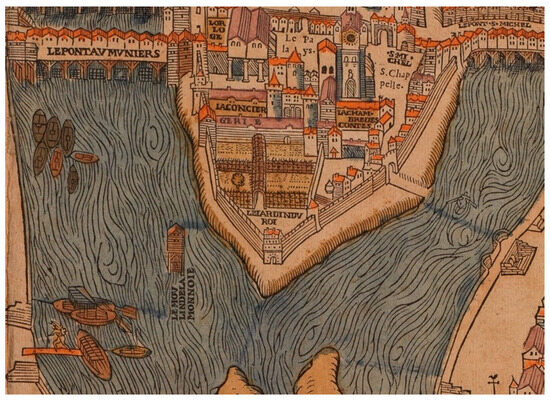 Upon coming into possession of seeds from a North American tree in 1620–1622, Robin had few public places in which to plant them. The Jardin du Roi on the far western tip of Ile-de-la-Cité, where he had cultivated simples and ornamental flowers, ceased to exist after 1608. This small walled and gridded royal garden, enclosed within the Palais de la Cité once occupied by successive French kings, is visible on the eastern-oriented map of Paris made by Olivier Truschet and Germain Hoyau around 1552-3 [Figure 5 and Figure 6].5 By the mid-sixteenth century, the palace complex functioned as the administrative hub of the crown, with buildings dedicated to the royal judiciary, treasury, chapel, and prison. The royal garden on the Ile-de-la-Cité was demolished in 1608 when Henri IV initiated work on the Place Dauphine residential development, an extension of the campaign begun by Henri III in 1578 to further develop the city’s central island. The first step in Henri III’s urbanization project was to have plans drawn up for the Pont Neuf, a bridge that spanned the end of the island to connect the right and left banks of the city to the end of the island, which was expanded further westward to include what is today the Square du Vert-Galant. Work on the Pont Neuf proceeded haltingly until 1599 when Henri IV recommitted to completing the project, which happened in 1606 (Ballon 1991, pp. 114–22). The royal garden remained intact and planted with herbs and flowers through these developments until around 1607–1608 when the plot of land was designated for the new Place Dauphine. It is possible, then, that Vallet and Robin’s Jardin du roy, published in 1608, was intended to rematerialize the historic royal garden on the Ile-de-la-Cité—an imagined garden on paper made to stand in for the lost physical garden.