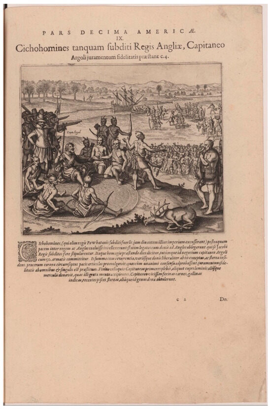 Cichohomines tanquam subditi Regis Angliae, Capitaneo Argoli juramentum fidelitatis praestant published by Johann Theodor de Bry in Americæ (Oppenheim, 1619). John Carter Brown Library, 35311, Brown University. Courtesy of the John Carter Brown Library.