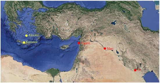 2 | For a discussion and review of such evidence from the Neolithic through Bronze Age periods, see (), especially 1–7. For extended consideration through the time of Alexander the Great, see (). For the most recent work in this field as a result of an international workshop hosted by the University of Oxford in December 2022, see (). The modern understanding of relationships between the Aegean, Mesopotamia, and Egypt, in all permutations and combinations, continues increasing in complexity and nuance, particularly with the veritable renaissance catalyzed by scientific materials analysis (). Although countless parallels exist between Egypt and the Aegean, the purpose of the present paper is to focus on possible relationships between the Aegean and Mesopotamia to facilitate possibilities for alternate perspectives and interpretations regarding a single wall painting from Akrotiri, Thera. |