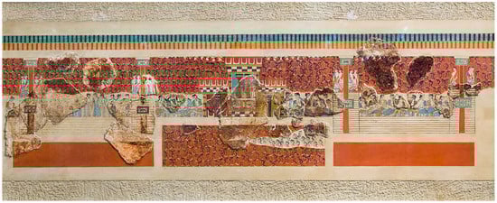 Reconstruction of the Grandstand Fresco from Knossos, Crete. Middle Minoan III–Late Minoan IA (1600–1450 BCE). Lime plaster and pigment. Watercolor painting by Emile Gilliéron. Early 20th century. Image courtesy of Harvard Art Museum. Website: https://hvrd.art/o/291769 (accessed on 23 November 2023).