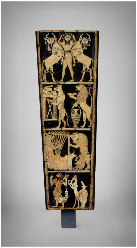 The front panel of the bull-headed lyre, recovered from The King’s Grave from the Royal Tombs at Ur (Early Dynastic III; 2550–2450 BCE), shows anthropomimetic and anthropomorphized animals—some natural and some supernatural—in four vertical registers (Figure 5; ). Each of these figures appears to engage in different phases of a funerary ritual, including games (wrestling/grappling), food preparation/sacrifice, feasting, the playing of musical instruments (including the bull-headed lyre), and the final meeting of the deceased with the scorpion man at the entrance of the underworld ().