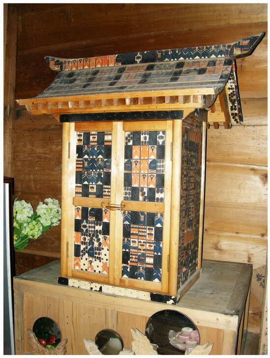 In February of 2019, Asahi Television Broadcasting aired a TV program, Potsun to ikkenya (ポツンと一軒家, “Lone House”), which brought the attention of the audience to an unusual miniature wooden shrine (zushi 厨子) to a Buddhist deity, Bodhisattva Kannon (観音), inside a small temple in a secluded apple orchard in Sannohe, Aomori Prefecture, Japan (Asahi Television Broadcasting 2019). Enshrined within the Nose Kannon Hall (Nose Kannon-dō 野瀬観音堂or Nose Shō-Kanzeon-dō 野瀬正[聖]観世音堂), the exterior of this shrine is decorated with what is known as “black cards” (kurofuda 黒札) in abstract designs of bold red and black colors, a regional variation of the Japanese playing cards, karuta カルタ, derived from the Latin/Italo-Portuguese four-suited cards, carta (Figure 1). The shrine protects the central deity of the hall: a circular iron mirror, generally known as “hanging Buddha” (kakebotoke 懸け仏) with the small relief images of the Bodhisattva Shō-Kanzeon (Sk. Āryāvalokiteśvara) flanked by two attending deities, whose identities remain unknown (Figure 2). Due to this unique decoration of the central shrine, the local devotees nicknamed the Nose Kannon Hall the “Karuta Hall” (Karuta-dō カルタ堂) that housed “the kami deity of gambling” (bakuchi no kamisama 博打の神様).