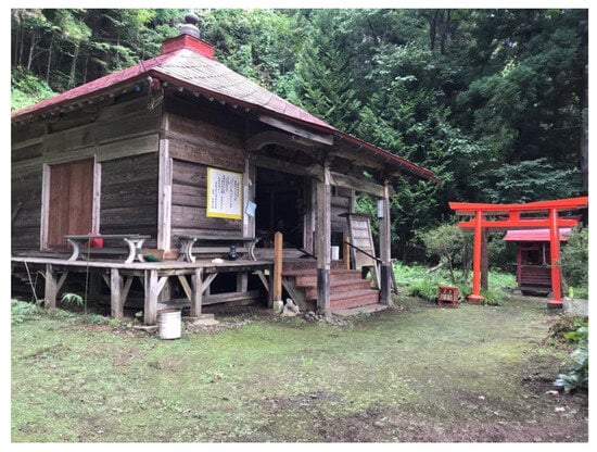 A stone-built miniature shrine dedicated to “Kudō Daimyōjin” next to the Kannon Hall, with a wooden board, possibly an ema rack, in between. Photo courtesy of Dr. Iwasaki Mariko, 6 September 2020.