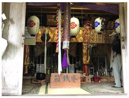 The public opening of the Nose Kannon zushi to display the icon used to happen every sixty years, then every thirty years, and it now occurs every ten years (Sannohe Chōshi Henshū-iinkai 1997, p. 264). These occasional events to display the Shō-Kanzeon certainly attracted visitors and created opportunities for social gatherings, as public displays of hibutsu became popular in the Edo period and turned into a combination of “sacredness with secularized ways” for a Buddhist facility to secure economic and symbolic capital (Rambelli 2002, p. 275). Decennial public openings still happen at Nose Kannon Hall today for visiting believers and nonbelievers alike