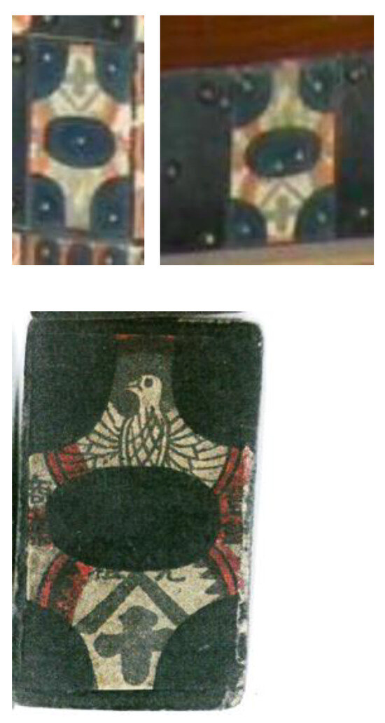The Kansei reforms, in fact, fueled the development of countless variations of localized karuta games in the nineteenth century with diverse regional designs inspired by the original European pattern because many karuta makers fled from Edo (present-day Tokyo) and Kyoto to regional areas to avoid punishment where they established local workshops (Ebashi 2015, pp. 209–10). The production of regional cards (chihōfuda 地方札) continued well into the modern period. For instance, kurofuda (黒札), which is used to decorate the miniature shrine at the Nose Kannon Hall, first appeared in the late eighteenth century and popularly circulated in northeast Japan (Figure 8). Regional karuta shared certain principles of simplification or abstraction of patterns, which may have had more to do with the economy of production than the actual game-playing rules and necessities (Jiang 2022, pp. 61–83). However, there were enough differences among chihōfuda to provide insights into regional characteristics or the movement of people.
