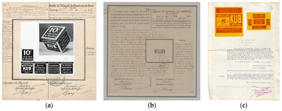 Left to right: (a) trademark registration for Bouillon KUB, consisting of “a box in cubic form,” 26 July 1909; (b) trademark registration for the mark “KUB,” 24 February 1910; (c) model registration of a metallic box for an alimentary product designated by the name “Bouillon Kub,” 26 July 1910. Images (a,c) courtesy of Archives Historiques Nestlé, Vevey. Image (b) courtesy of the archives of the French Patent and Trademark Office (INPI), Paris.