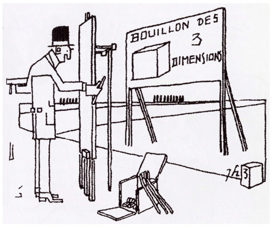 By 1912, seemingly all of Cubism’s enemies marshalled bouillon Kub to ridicule the ascendant art movement. Louis Vauxcelles, among the first critics to dismiss the art of “Bracke” (sic! Georges Braque) as “bizarreries cubiques,”9 now channeled the avant-garde’s passion for King Ubu (Alfred Jarry’s notorious 1896 absurdist drama) and Kub’s omnipresent packaging (featuring the letters K-U-B-U in triangular quadrants) to coronate Picasso with a loathsome crown: “Picasso who, ten years ago, was not lacking in talent, is the leader of the Cubist gentlemen, something like Father Ubu-Kub.”10 The caricaturist Joseph Hémard similarly mashed up references to the avant-garde and marketing in a “Cubist” portrait of Armand Fallières, President of France, for the satirical magazine Le Rire (Figure 4). Along with Cubist mainstays such as a bottle and glass of wine, dice, and a crystalline, faceted surface, Hémard reworked KUB’s popular slogan, “Demand the K,” into a mock Cubist advertisement: “With Cube painting, demand the Cu.”11 Finally, it was Hemand’s July 1912 caricature for La Vie Parisienne—in which a cubic and (nearly) two-dimensional painter paints a billboard advertising “Bouillon in 3 dimensions”12—that laid the groundwork for Picasso’s contemporaneous rebuttal (Figure 5).