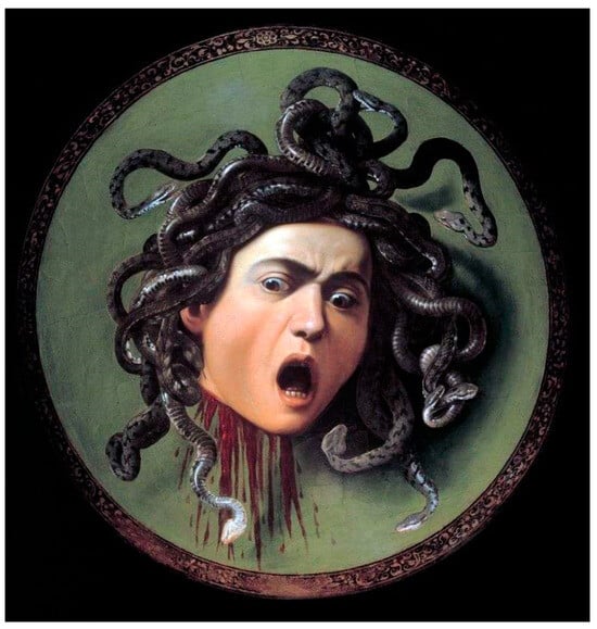 Caravaggio, Medusa, ca. 1596–1598, oil on canvas, φ 55 cm, Galleria degli Uffizi, Florence. Wikimedia Commons.