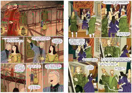 Susan Vreeland also portrays this evolution in the pages of an equally classic and emotional novel, published in 2002. In this case too, Gentileschi’s works are the silent “protagonists” around which the story revolves, although the American author places the emphasis differently. For example, this text opens with another element of Artemisia’s “founding myth”: the Sybil’s torture that had been “designed to bring truth to women’s lips”(Susan Vreeland 2002, p. 2). What is more, Vreeland devotes more attention to the person of Orazio. In contrast to the rather unflattering, or at least controversial, image outlined by Lapierre, Orazio in this interpretation is a loving father and grandfather. His genuinely affectionate figure forms the plot buckle: Orazio supports his daughter and sympathises with her in her moment of pain, while in the final passages, it is she, digested with grief, who bids him farewell forever in cold London. In contrast, on the pages of a graphic novel published in 2017 by Nathalie Ferlut and Tamia Baudouin (Figure 9 and Figure 10), a narrative bracket is formed by the motif of motherhood.21 Undoubtedly, the merit of this publication is that it considers the figure of Prudence, the artist’s mother, who died in 1605, a figure almost absent from other biographies; Prudence, whose name was inherited by Artemisia’s daughter. In turn, the motif of lost motherhood, that is, the grief and mourning experience following the death of her son Cristofano, is accentuated, in a beautiful, symbolic form, by Gina Siciliano in her ball-pen graphic novel titled I Know What I Am (see Siciliano 2019; see also: Treves n.d.b).22