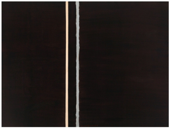 Critical writing, like visual imagery, has a feel to it. I have sometimes used the figure of chiasmus as an example of a logical and rhetorical form that causes the writer, as well as the reader, to feel both intelligent and satisfied. This is the sensation, the feeling, the affect that accompanies the logical form of the thought.11 I might even experience the feeling before having succeeded in grasping the thought. Chiasmus is useful in wriggling out of an intellectual cul-de-sac. Statements about art, a difficult topic, often assume chiasmic form. In 1966, Barnett Newman said: “Just as I affect the canvas, so does the canvas affect me.”12 The mirroring symmetry of his sentence has an emotional appeal, like symmetry in a human face, even though Newman seems ambivalent about symmetry in art, sometimes featuring it and sometimes not at all (Figure 2). The philosopher Jean-Luc Nancy provides a more ambitious version of chiasmus in locating aesthetic emotion at the origin of humanity: “Man began in … a gesture. At this [gesture], man trembled, and this trembling was him.”13 We can paraphrase to make the structure more obvious: man was the being who trembled; trembling was the essence of man. Or, still more obvious: man was trembling; trembling was man. Entity X is to entity Y, as Y is to X. It will always look and sound good. It will always feel good. As for the thought that Nancy expressed in this manner, the trembling was a feeling that, as in my extension of Peirce, experienced the “man” as much as the “man” became man (human) by experiencing trembling.