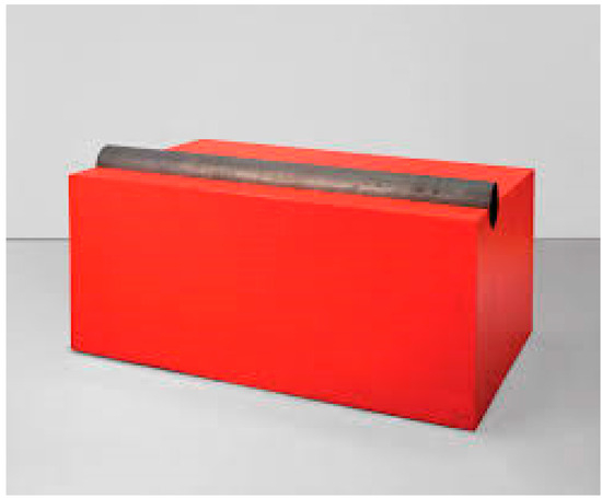 Bear in mind that works by Judd elicit multiple sensory observations independent of any realizations of logical or hierarchical order. Judd’s art does not assume the form of a premise and a set of facts leading to a conclusion—we might say instead that his art consists only of facts, nothing more than material and perceptual facts in interaction. We normally think of a whole as constituted of structured elements of some kind. But the readily identifiable elements of a work by Judd—for instance, a red rectangular prism coupled with a gray metallic pipe, asymmetrically positioned and set into a channel (Figure 3)—resist forming a composition of dominant and subordinate parts, even though one element may be larger than the other or one may be supporting the other. Each part will appear as present to sense as is the whole. Because Judd’s constructions counter any potential compositional order, we perceive both the parts and the whole for what they are: they exist together, but are also unconnected, like the before and after of an intuitive leap. This so-called, hard-core minimalist relied on feeling to adjust and complete a work.
