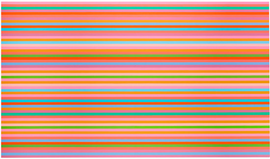 Artists, whether “abstract” or “representational,” often react to cultural pressures by enhancing the sensory qualities of their work, as if to provide physical immunity to ideological mind-control. The physical has a tonic effect on the mental. Sensation clears the mind. Viewing one of Riley’s stripe paintings (Figure 8), I might be tempted to study it analytically, to comprehend its effect through the chemistry of its complex pigment mixtures. According to Riley, however, the last thing a viewer should do is worry about the singular science of her art. It is sufficient to name the colors as red, green, blue, and yellow. Forget about identifying them more precisely, Riley says—just look at them.28