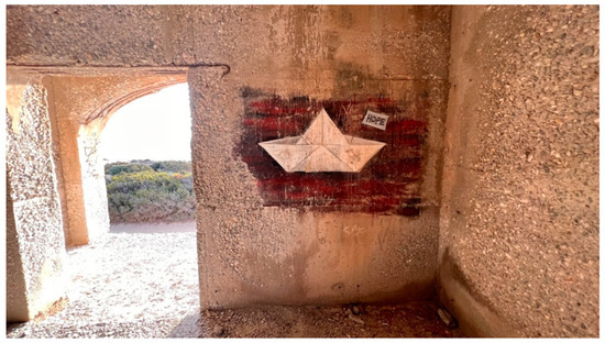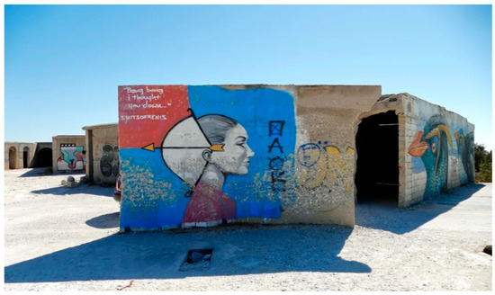 Abandoned ruins are harmoniously incorporated into the landscape of nature, encompassing a cedar forest and a sandy beach. During our analysis of the visual messages advertising the ruins of Aliko, we identified several categories of murals and graffiti. Murals and graffiti were divided into two categories: murals, thoughtful and planned works; and graffiti (Figure 1 and Figure 2), characterised by greater spontaneity and immediacy. Additionally, we focus on forms of interactive art that engage viewers, emphasising the interactive nature of this artistic space.