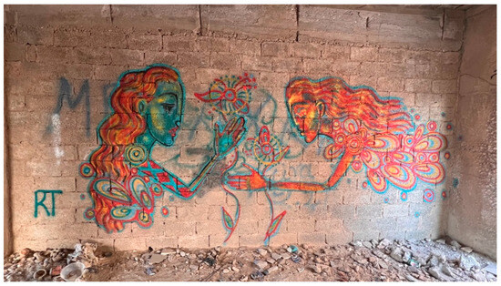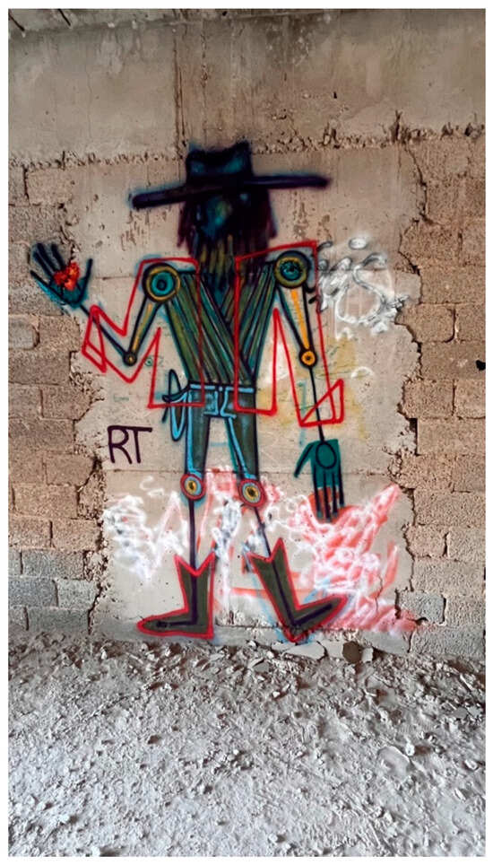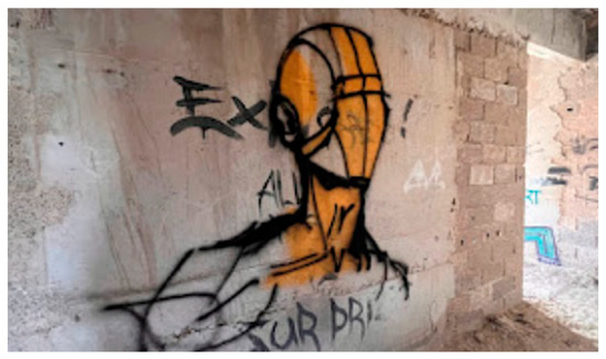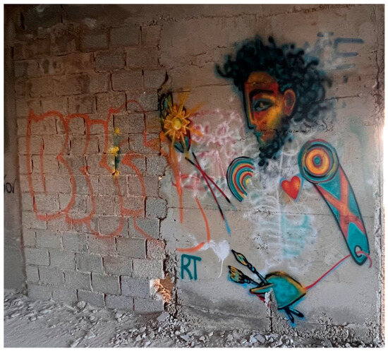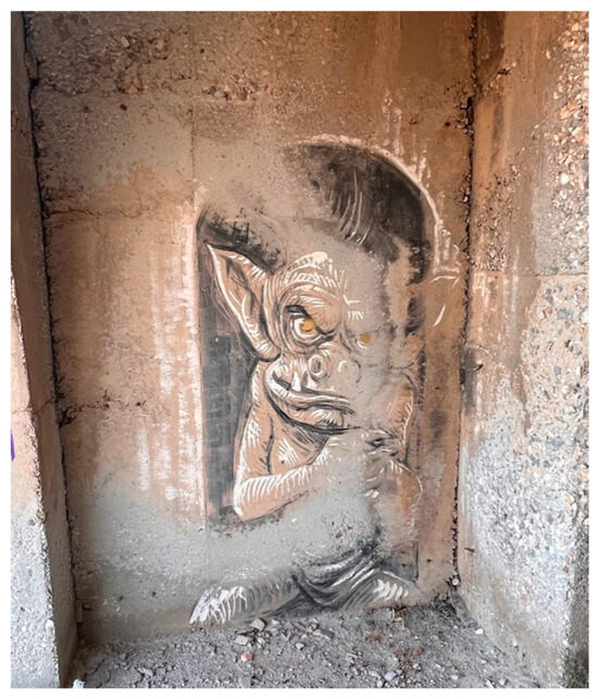 The mural “Elf Figure” (Figure 5) is perceived as a celebration of life and its cyclical nature. The child, traditionally seen as a symbol of beginning and potential, is depicted in the context of ruins, which may suggest the uninterrupted continuity of life and constant renewal and hope, even in the face of decline and destruction. In this contrast, the mural speaks of the resilience of the human spirit and the optimism that can be found even in the most abandoned and forgotten places. The wreath of flowers is a universal symbol of vitality, beauty, and growth, but it can also refer to traditions and rituals. The child’s smile, carefree and bright, may remind us of the simplicity and purity often attributed to childhood.