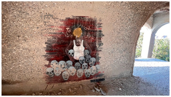 By examining the murals, we noticed the depth of the artist’s message. In the mural “Madness” (Figure 7), we observe the transcendent aspect of human nature, manifesting itself in the rich texture and expression of the face. Compositionally, the mural focuses on the face, especially the eyes of the figure, which are depicted in extraordinary detail. The dynamics of the gaze are emphasised by contrasting lines and shapes that seem to emanate from the eyes, creating a halo of complex patterns and textures. These patterns, perhaps intentionally reminiscent of neural networks, may symbolise the complexity of the human mind and the richness of the internal world of the portrayed person. Differences in texture and layering can affect the perception of the viewer, suggesting metaphorical layers of personality or experiences that shape a person. The lines and patterns are not just visual elements (Lennon 2014) but symbolic reflections of the inner, intangible reality that extends beyond what is visible. In psychology and art, the gaze is often interpreted as an expression of emotions and internal states, and in this case, it may symbolise the search for truth or confrontation with reality. In a sociocultural context, murals can impact issues of identity through contemporary discussions about individuality and the place of the individual in society. The patterns radiating from the eyes may symbolise the impact a person has on his or her surroundings, as well as how external forces shape individual perceptions and experiences.