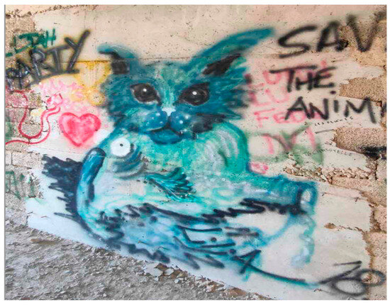 Another interesting example is the mural titled “Sea Breeze” by WD (Wild Drawing). The image depicts a mysterious figure that is reminiscent of a goddess emerging from sea waves (Figure 3). This mural is an example of urban art that engages viewers not only visually (Kazanowski 2018) but also intellectually. It is a work open to interpretation that can serve as a catalyst for reflection on the relationship between humans and nature, as well as our role in environmental protection. In a broader context, the mural can be viewed as a commentary on the long cultural history in which the sea has always played a central role in the human imagination.