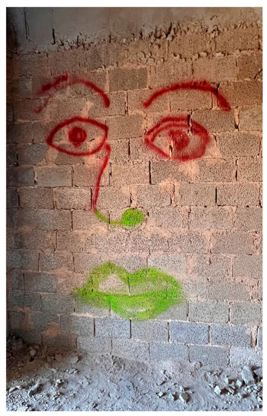 In the ruins of the Aliko Hotel, there are two graffiti featuring the motif of a woman and a bird. Both were created by Skitsofrenis (Figure 9 and Figure 10). The only change is in the facial expressions of the characters. In the first case (Figure 9), the woman’s facial expression is decisive, and the bird is very expressive, as if she wants to break free. This is emphasised by contrasting colours. The “studium” of this graffiti can interpret the female figure with bird elements as a symbol of freedom or transformation. The way the bird motif seems to be both part of and an extension of the character suggests a connection between the human and natural world, emphasising the idea of symbiosis or spiritual elevation. The “punktum” of this graffiti could be focused on the feathers that smoothly transition into the woman’s hair, creating a visual play between the human and natural. This detail may attract the viewer’s attention, provoking reflection on the connection between the beauty of the human and the natural world, symbolising unity and harmony. It may also suggest transformation or spiritual development, where feathers, typically associated with flight and the sky, might symbolise aspiration to higher spheres of existence or the desire for freedom.