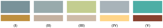 The collected color harmony datasets were further tested for hue similarity (Figure 8). To do so, we calculated the ratio of colors representing six main categories (red, orange, yellow, green, blue, and purple) for each of the charts in each country. This analysis showed that participants from different countries tried to match the chosen hue with the existing ones. In most cases, participants chose a color from the same or adjacent category as the hue in the bottom or (less frequently) the top band. In color choice responses for a stimulus with a wide green stripe (stimuli III and V), there was an especially noticeable increase in the number of green shades.