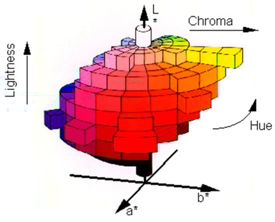 The CIELAB color space, defined by the International Commission on Illumination (abbreviated CIE) in 1976, expresses color as three coordinates (Carter et al. 2018). The lightness value (L*) ranges from 0 (black) to 100 (white). Two other coordinates represent the position of the color between magenta and green (axis a*, where negative values indicate green and positive values indicate magenta) and between yellow and blue (axis b*, where negative values indicate blue and positive values indicate yellow).