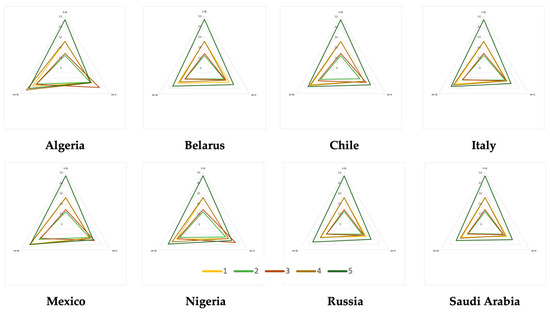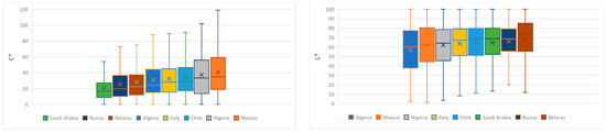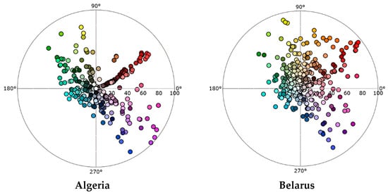 Analysis of chroma–lightness patterns revealed that representatives of different cultures used fundamentally different strategies for building harmonious color combinations. Residents of Mexico, Nigeria, Chile, Italy, and Algeria were more likely to choose colors with higher chroma (31.20 ≤ mean C ≤ 40.77). On the contrary, participants from Saudi Arabia, Russia, and Belarus preferred moderate colors (20.92 ≤ mean C ≤ 28.31) (Figure 5 left).
