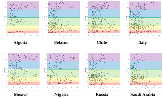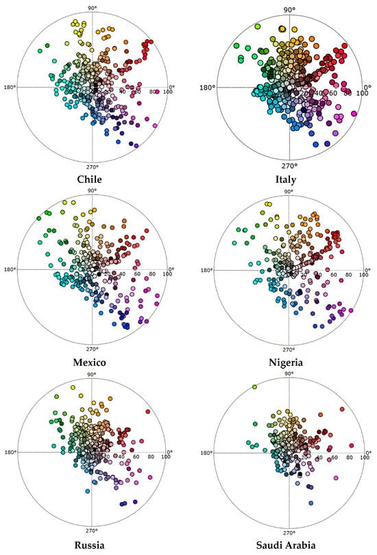 The hue angle (h°) of the chosen colors correlated with the chroma (C). Red and purple colors (290 ≤ h° < 40) had greater chroma than orange, yellow, and green ones (40 ≤ h° < 196). This trend was most pronounced in Chile, Mexico, and Italy. Moreover, in all eight countries, blue colors (196 ≤ h° < 290) had the lowest chroma (Figure 9).