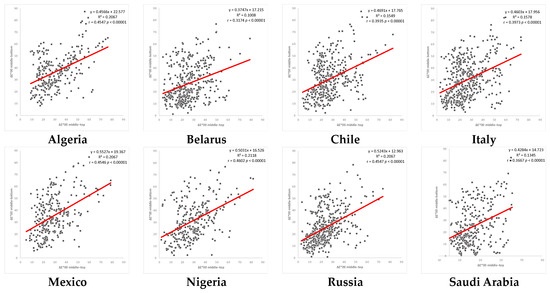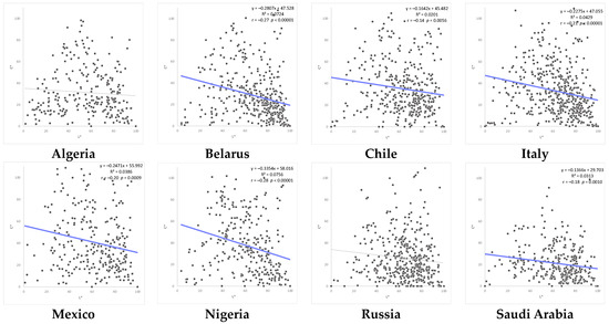 In six of the eight countries, we found a weak negative correlation between lightness (L*) and chroma (C*), i.e., the higher the C-value, the lower the lightness. Such a trend was not observed only in the responses of participants from Algeria and Russia (Figure 6).