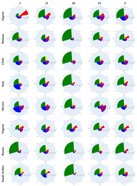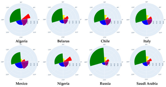 Polar area diagrams representing red, orange, yellow, green, blue, and purple category sizes in different countries.