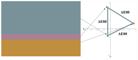 To compute the triangles’ angles in CIELAB color space, we employed the cosine Formulas (2)–(4):