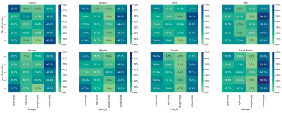 To effectively compare the color triad properties received in different countries, we carried out cluster analysis of the data in three stages. In the first stage, we clustered the “geometric” values (triangles’ side lengths, angles, and areas) of every color triad of each received response plotted in CIELAB using the k-means algorithm (Matlab Statistics and Machine Learning Toolbox, The MathWorks, Inc., Natick, MA, USA) with k = 5 (Hartigan and Wong 1979). In the next step, we constructed a dependency matrix to determine how percentages of respondents from the study’s countries aligned with types of identified clusters. In the final stage, we applied Ward’s hierarchical clustering method (https://scikit-learn.org/, accessed on 20 February 2024) (Ward 1963) to group the subsamples of different countries based on the similarity of the “geometric” properties of the color combinations obtained there.