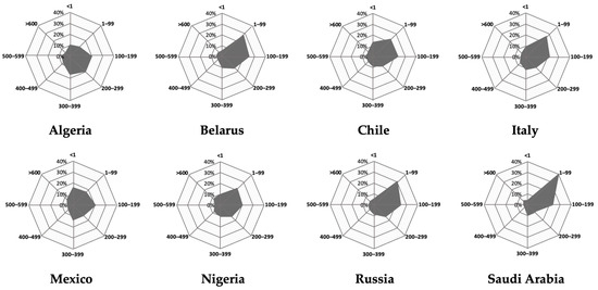 Such analysis revealed that the color selections were unevenly distributed across the basic categories within the color circle (Figure 7). Participants in all eight countries tended to choose “warmer” colors (greens, yellows, reds), while “colder” colors (blue-greens, blues, and purples) were selected much less. In all countries, the most popular color category proved to be green: green shades with different lightness and chroma comprised a third of all the responses received across the various countries. Among the participants across the various countries, the rarest choices for creating color harmony were orange tones. Residents of Algeria almost never selected orange shades: among their responses, we found no more than three such colors (less than 1%). However, Algeria and Nigeria proved to feature more choices of colors from the red category (28% and 26%, respectively) than observed among responses from other countries. In Mexico, Algeria, Chile, and Italy participants more frequently chose blue (selection frequency of 16–19%) and purple colors (selection frequency of 18–22%).