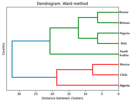 Dendrogram representing outcomes of the cluster analysis of countries by the degree of similarity of the “geometry” of harmonious color combinations in the CIELAB color space.