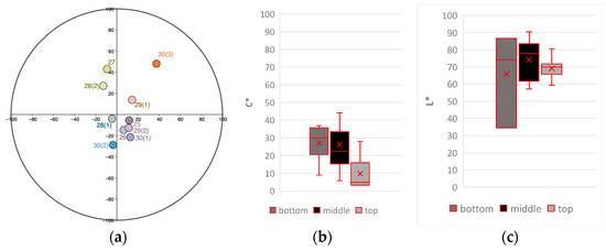 Colors selected by Matyushin: projection into the CIELCh color circle (a); chroma (C*) (b) and lightness (L*) (c); boxplots represent the interquartile range; horizontal lines indicate medians; and whiskers indicate the outliers below the 1st quartile or above the 3rd quartile.