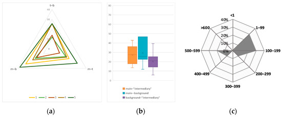 Mean color differences CIEDE2000 (∆E*00) between the middle (chosen) color and the color of the top stripe (m–t), the middle (chosen) color and the color of the bottom stripe (m–b), and the top and bottom stripe colors (t–b) for five different stimuli in Matyushin’s color triads (a); the lengths (color differences CIEDE2000) of triangle sides (b); a radar chart showing the proportion of triangles with different areas; spokes represent groups of triangles by area from <1 (∆E*00)2 (very small) to > 600 (∆E*00)2 (very large); the radial axis shows the percentage of triangles with a particular area (c).