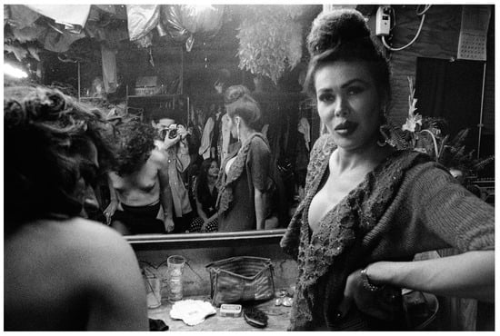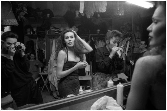Hernández 2014, p. 145). His photographs of queer Latinx subjects frequently usher us into their dressing rooms, bringing our attention to one of the most significant features of his photography: his repeated self-inclusion within his pictures of LA’s trans Latinx and drag performers behind the stage.