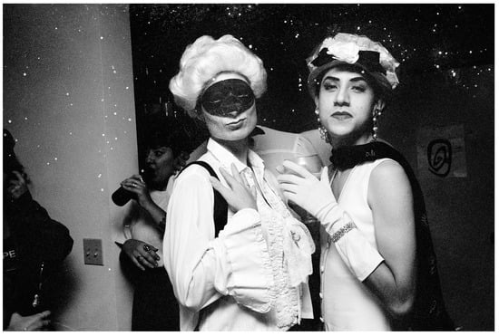 Hernández 2014, p. 146). Face half-obscured by a costume mask, the figure on the left purses their lips towards the camera. Donning a white wig and frilled blouse, their presentation easily invokes the aesthetics of the nineteenth-century dandy, providing a stark juxtaposition to the Latinx woman just behind them, whose clothing and poses keep closer with the fashion of Southern California in the 1990s. To the right, their partner is similarly dressed in white and adorned in flowers, makeup, and pearls. Though Rivera only offers this photograph in monochrome, this subject’s lips are clearly painted and, between the beauty mark on her left cheek, her groomed brows, and her sultry fan of their lashes, she evokes all the polished beauty of Marilyn Monroe.