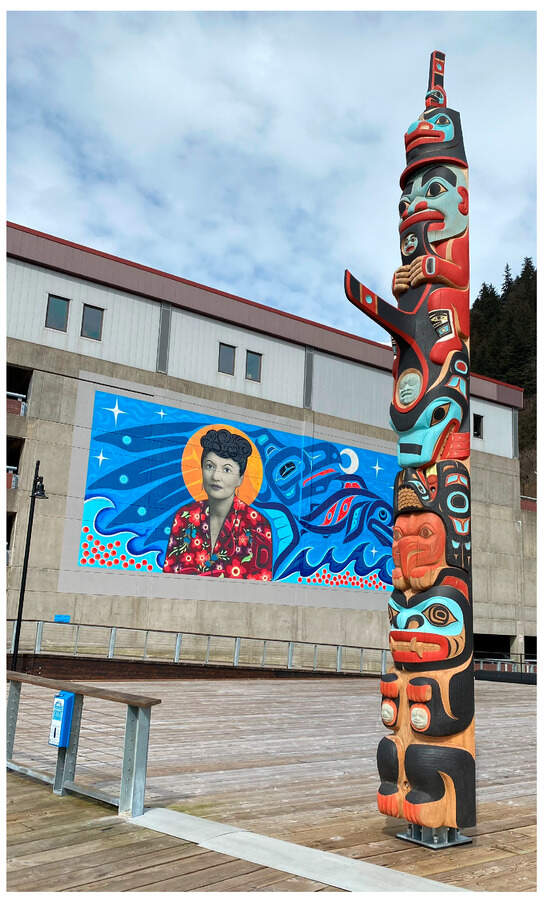 Kaagwaantaan (Eagle/Wolf) Pole by master carver Nicholas Galanin (Tlingit/Unangax̂) with apprentices William L. Burkhart Jr. (Tlingit), Lee Burkhart (Tlingit), and Merritt Johnson. From the bottom up, this pole depicts three significant crests: the Bear, Eagle, and Killer Whale. Atop the crests, a Kaagwaantaan clan member wears a Killer Whale clan hat. Crystal Worl (Deg Hit’an/Filipino/Tlingit) completed the mural honoring Tlingit civil rights activist Elizabeth Peratrovich Ḵaax̲gal.aat (1911–1958) in 2021. Photograph by Megan A. Smetzer.