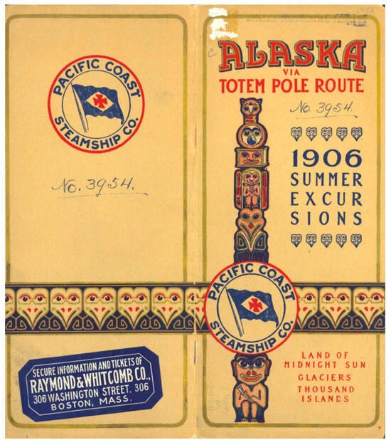 Cover of a 1906 Pacific Coast Steamship Company brochure advertising the “totem pole route”. Alaska State Library, Steamship Company Publications and Promotional Materials, ca. 1887-[ongoing], MS68-1-01-05-cover.
