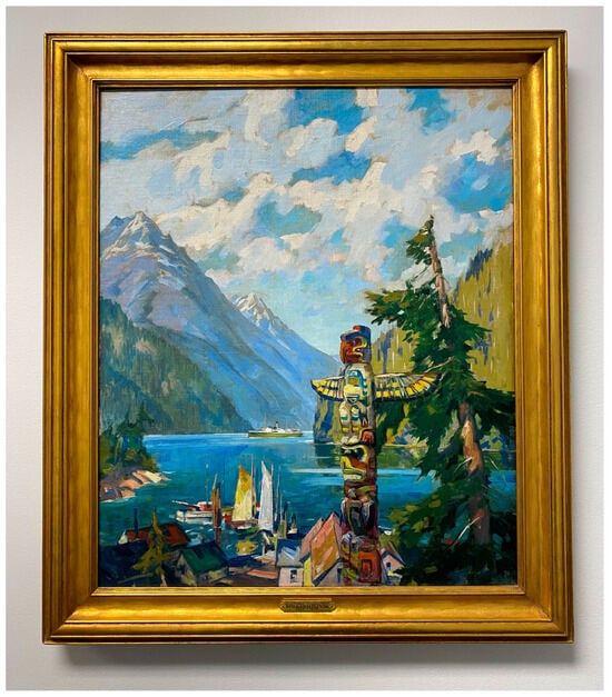 Prior to the intervention of Chief Mathias Joe’s pole, this decoupling of Squamish, Musqueam and Tsleil-Waututh presence from their own territory and the imposition instead of Kwakwaka’wakw and Haida poles from further north aligned with similar tourist iconography all along the coast; this included the Alaska’s Steamship Company’s “Totem Pole Route” tours, Seattle’s Pioneer Square pole, and iconic poles on the flyers for the city’s 1909 Alaska–Yukon Pacific Exposition. These expectations, that poles above all else represent the arts of the Northwest Coast, created the circumstances that enabled the winged pole originally carved by Kwakwaka’wakw artist Charlie James Yaguklas in the early 1900s to become the most iconic symbol for Stanley Park. Poles located in Alaska were also visually supplanted by James’s piece, as indicated by its central position in Willard R. Cox’s 1929 painting titled Southeast Alaska (Figure 3).13 Even Chief Mathias Joe’s unique Squamish pole incorporated wings, due in part to the ubiquity of James’ work (Hawker 2003, p. 108; Jonaitis 2012, p. 31) which, by 1936, had come to represent the entire Pacific Coast region for tourists travelling along the Inside Passage.
