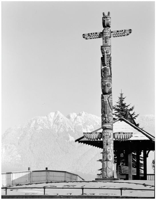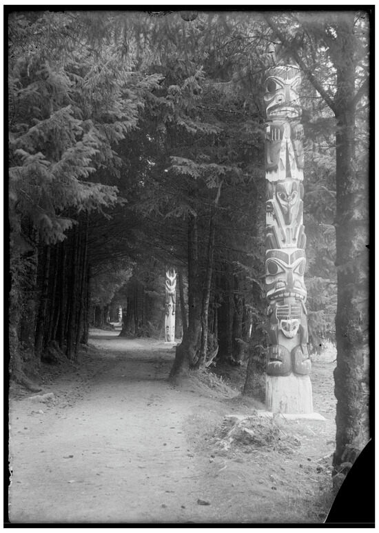 Similar to the civic programs that created Alaskan totem pole parks, the City of Vancouver purchased poles from Kwakwaka’wakw and Haida communities, installing them in Stanley Park in 1920 (Figure 7). This centrally located peninsula in what is now known as Burrard Inlet had been home to Squamish Sḵwxwú7mesh, Musqueam xʷməθkʷəy̓əm, and Tsleil-Waututh səlilwətaɬ peoples for thousands of years. In 1863, the British created a military reserve on this unceded territory. In 1888, shortly after the City of Vancouver was incorporated, this reserve became Stanley Park, the first large-scale park in the region that drew on British and American precedents to create a seemingly natural green space untouched by human intervention. By 1931, the villages and most of their inhabitants, including χʷay̓ χʷəy̓ (near Lumberman’s Arch) and spapey’eq (now Brockton Point), had been forcibly removed, in spite of legal challenges from Indigenous residents (Wilson 2016). Regardless of their ongoing resistance to the outlawing of the potlatch in British Columbia in 1884 through the laws prohibiting the pursuit of land claims beginning in 1927, local Indigenous peoples were pushed to the margins of settler society in favor of a nostalgic and aesthetically pleasing attraction that sanitized the deeply problematic history of colonialism in the region.11