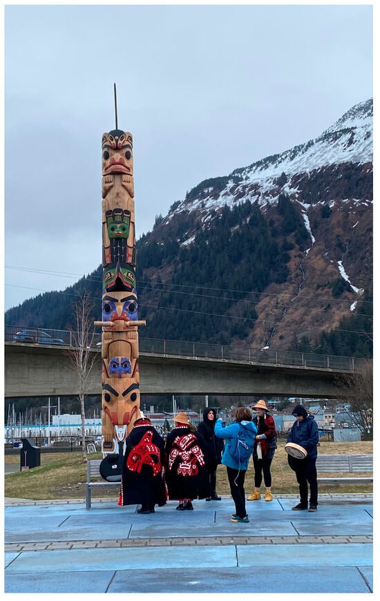 On a blustery spring day in late April 2023, a six-hour outdoor dedication ceremony for the Kootéeyaa Deiyí/Totem Pole Trail took place in the heart of downtown Juneau on the Sealaska Heritage Arts Campus. Sponsored by the Sealaska Heritage Institute (SHI)1 with funds from local, state, and federal partners, including a USD 2.9 million grant from the Mellon Foundation, this multi-year project contributes to SHI’s plan to make Juneau the center of Northwest Coast art. Sparked by the controversial 2017 installation of a bronze sculpture honoring William H. Seward, who arranged the purchase of Alaska from Russia in 1867, and motivated by the perceived lack of master totem pole carvers in Alaska, SHI developed this project with the ultimate goal of raising thirty poles along the Juneau waterfront.2 As Rosita Worl Yeidiklas’akw and Kaaháni, the long-time President of SHI has expressed, these poles serve multiple purposes. Not only are they a hard-fought assertion of Indigenous presence in the state’s capital, they are also a means to train emerging carvers using the customary mentor–apprenticeship system. At the same time, they serve to educate visitors and others about the Indigenous history of Southeast Alaska, which, as illustrated by the Seward sculpture, continues to be displaced in the twenty-first century.3 The Kootéeyaa Deiyí dedication ceremony celebrated the first twelve poles installed along the soon-to-be bustling waterfront where giant cruise ships disgorge tens of thousands of tourists throughout the summer months.4
