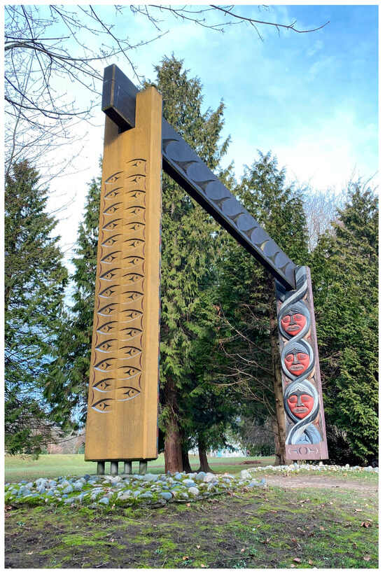 In the early 2000s, the City of Vancouver at long last publicly recognized the deeply troubling history of Stanley Park, and the problematic imposition of installing poles from northern regions of the Province onto unceded territories without proper protocols. In 2004 the city issued a call for proposals from artists of the Squamish, Musqueam and Tsleil-Waututh nations, and subsequently commissioned Susan Point, who by that time was one of the most prominent Musqueam artists in the region with an impressive portfolio of public artworks.16 Point created People Amongst the People—three gateways representing the three nations whose territories encompass the region. These portals, raised in 2008, welcome visitors to Brockton Point and provide a frame for the older northern poles in Stanley Park. Point’s imposing structures resembling Coast Salish interior house posts connected by roof beams are embellished with figures, both human and supernatural, as well as patterns reminiscent of Salish weaving (Figure 9, Figure 10 and Figure 11). Through these works, Point acknowledges the ancient and ongoing presence of Musqueam, Squamish, and Tsleil-Waututh people, and illustrates how deeply entwined weaving is within Salish ceremonial protocols, intergenerational relationships, and the environment (Watt 2019, pp. 67–77).
