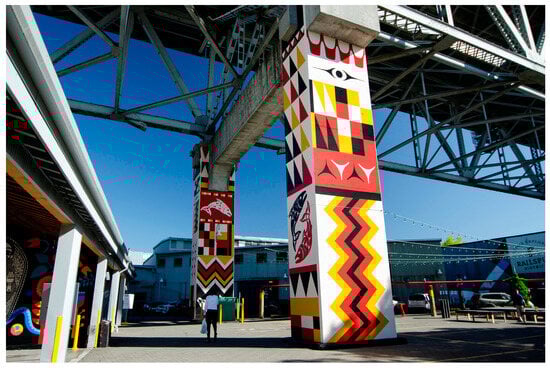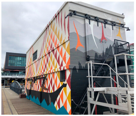 - George, Angela. n.d. Interview: Blanketing the City IV Artist Angela George. Vancouver Mural Festival. Available online: https://vanmuralfest.ca/blog/angela-george (accessed on 5 October 2023).