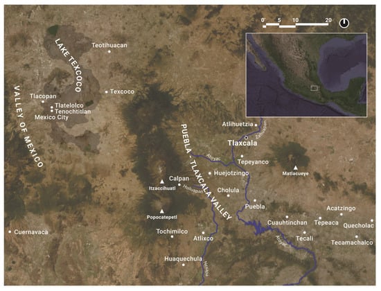 Map of the Puebla-Tlaxcala Valley and the Valley of Mexico (source: Esri, Maxar, Earthstar Geographics, and the GIS User Community; modified by Diego Irigoyen).