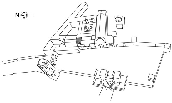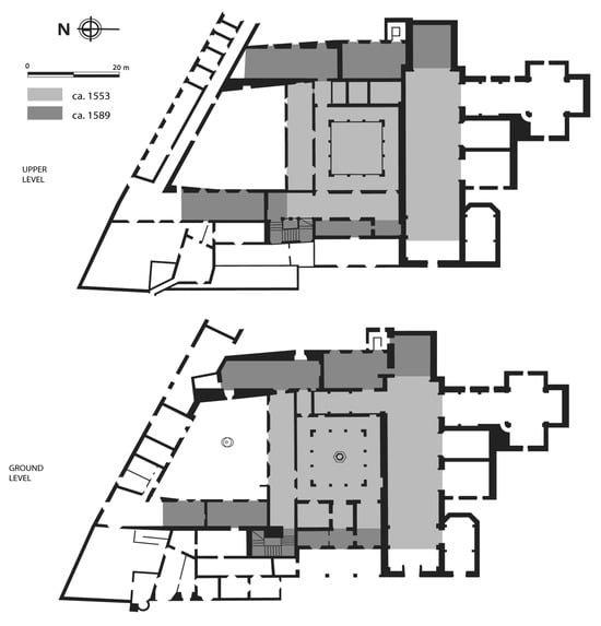 By 1589, the monastery building had doubled its footprint by adding a new quadrangle to the north of the original ca. 1553 cloister (Leyva 2014, p. 85; Camargo 1994, p. 211; Ciudad Real 1993, p. 74) (Figure 5).11 At this time, the original refectory and the original choir enclosure were demolished. They were replaced by a new refectory located in the new north quadrangle and the lofted choir over the church’s narthex, respectively. Significantly, these features were rebuilt in the shallower spaces of the west flank of the monastery, far removed from where the Franciscans prayed in solitude. The new locations for these key ritual sites also changed how Nahuas navigated the building. On the one hand, the Nahuas’ laboring activities were now confined to only the west side of the complex. On the other hand, the construction of new intermediary spaces on the ground floor put the Nahuas on a more circuitous route through the complex. Previously three intermediary spaces had stood between Nahuas and the old refectory; now there were nine spaces between the building’s main entrance and the new refectory. These new, segregated passageways thus restricted access to the primary channels through the building and forced the Nahuas to use other access points.